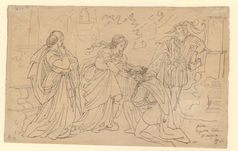 Carl Christian Vogel von Vogelstein was inspired by ancient reliefs, which also served as models for David d'Angers [20, 21], when illustrating Goethe's Tasso [19]. The theme and depiction of both the drama and the personalities – Tasso on one side and Goethe on the other – follow the tradition of ancient Greek laudatory speeches, known as panegyrics.