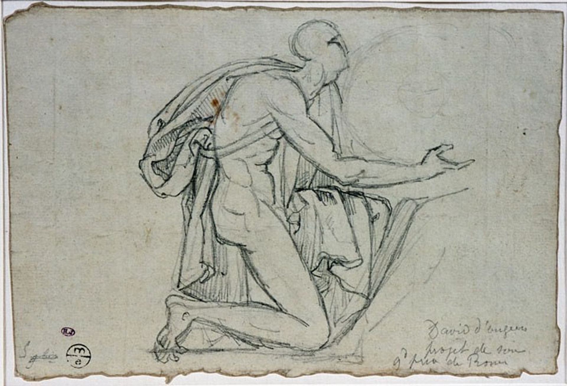 The kneeling figure [20] developed from soft to strong contours as the chalk became thicker. The improvements, known as pentimenti, reflect David d'Angers' search for the correct muscle structure. The change in the position of the lower leg and foot is also visible. He marked the shaded areas of the robe with parallel hatching, cross-hatching, and zigzag lines of varying intensity.